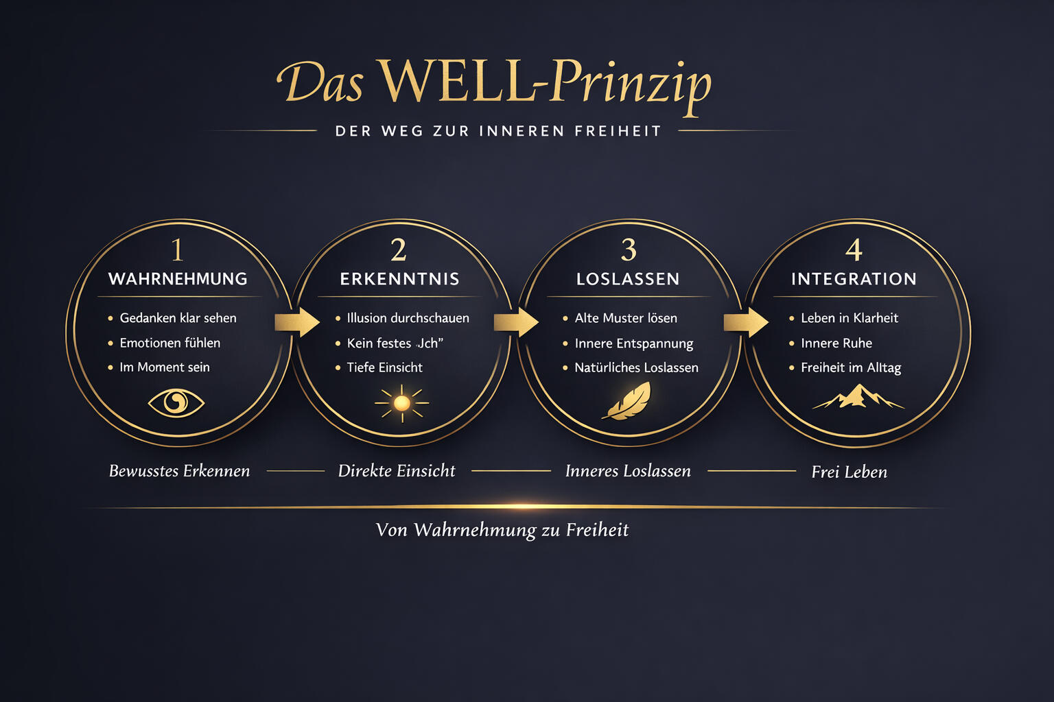 Aus dieser Erkenntnis heraus entstand kein neues spirituelles Konzept.Es entstand eine direkte, klare Struktur, die andere Menschen zuverlässig zur gleichen Erkenntnis führen kann.Das WELL-Prinzip.W -ahrnehmung.